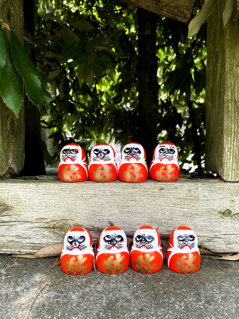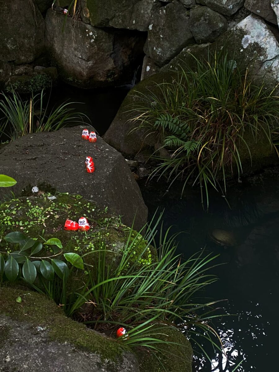 Entre musgos, árvores e pedras, os Darumas surgem como se sempre tivessem pertencido àquele lugar. Entrelaçados à natureza e espalhados por todos os cantos imagináveis, desde o portão de entrada à saída, as bolinhas vermelhas estão presentes do começo ao fim.