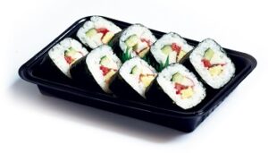 Sushi tradicional (8un.) com omelete, pepino, kani, bardana e gengibre.