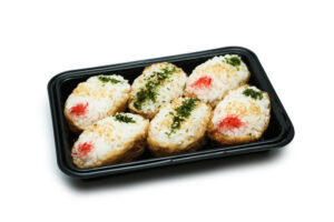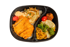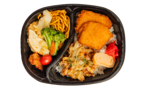 Arroz, frango empanado, macarrão, omelete, tempurá, frango karaguê, guioza suíno, tomatinho e gengibre.