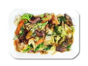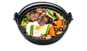 Vegano: macarrão de arroz ou de trigo (sem ovo), shimeji, legumes e molho vegano.