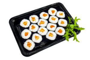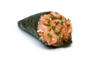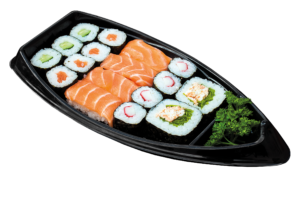 4 niguiri salmão, 4 hosso salmão, 4 hosso kani, 3 hosso pepino e 2 sushi salmão grelhado.