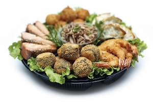 Arroz, tilápia empanada, macarrão, omelete, tempurá, frango karaguê, guioza suíno, tomatinho e gengibre.