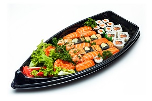 8 fatias de sashimi de salmão, 8 niguiri salmão, 4 niguiri skin, 4 luizinho salmão, 4 uramaki salmão com cream cheese, 8 hossomaki salmão