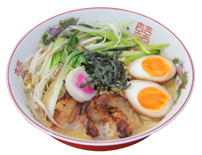 Macarrão de lámen com caldo à base de frango, carnes bovina e suína, acompanhado de panceta suína, alga marinha, verduras grelhadas, ovo, massa de peixe e cebolinha.