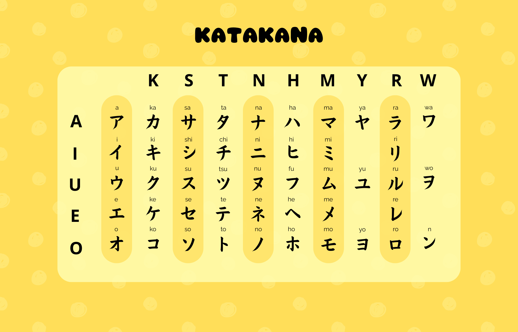 O alfabeto japonês (tanto o Hiragana quanto o Katakana) é organizado em uma tabela com 5 linhas e 10 colunas.